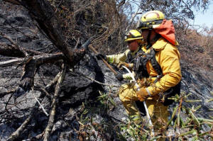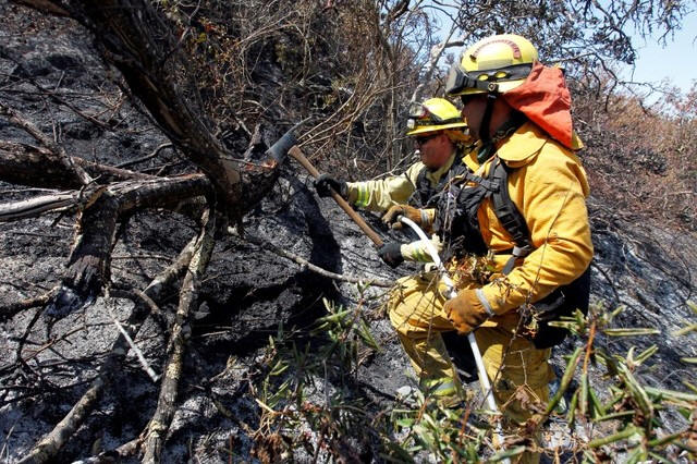 Firefighters use an axe to extinguish hotspots during the Soberanes