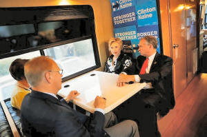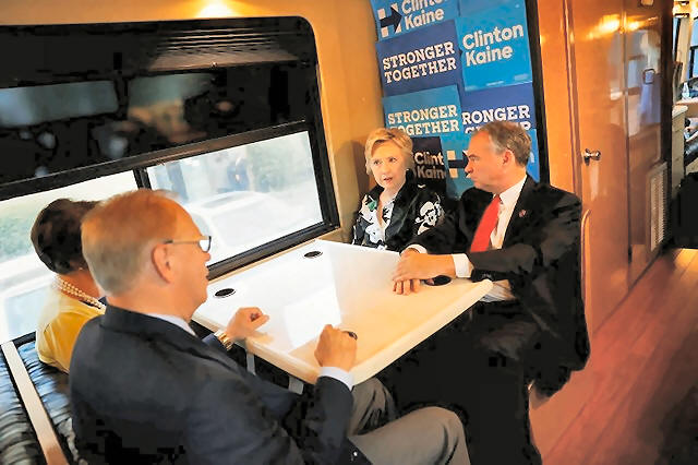 Democratic presidential nominee Hillary Clinton speaks with vice