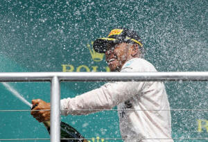 Mercedes' Lewis Hamilton sprays champagne after the race.