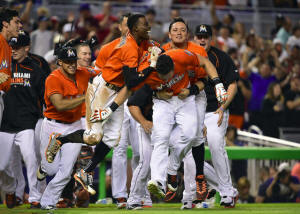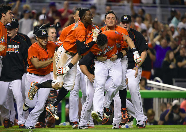 Marlins players celebrate after Marlins pinch hitter Derek Dietrich