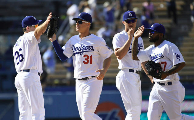Dodgers second baseman Chase Utley (26) and center fielder Joc