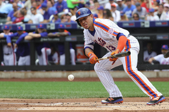 Mets shortstop Asdrubal Cabrera (13) bunts into fielders choice to