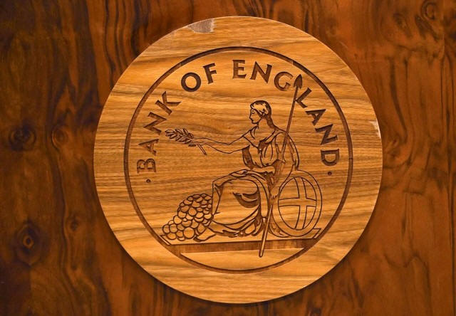 A wooden carving of the Bank of England logo is seen on a desk