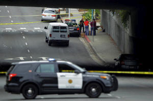 Police investigate the scene under a highway overpass where another