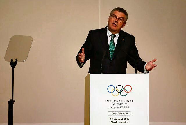 addresses the 129th IOC session in Rio de Janeiro, Brazil, August 1,
