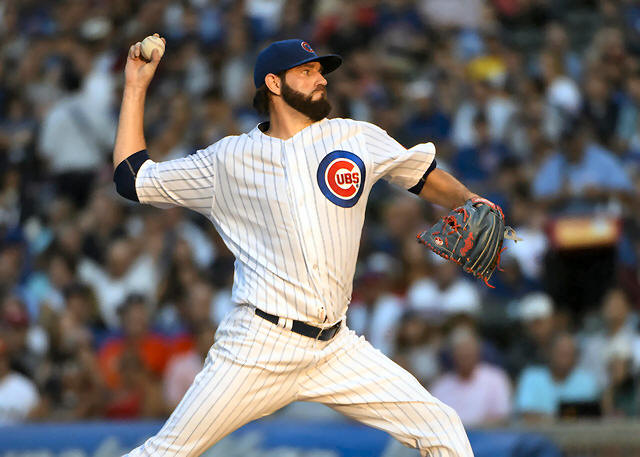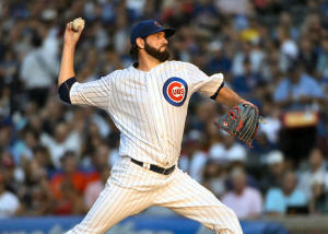 Cubs starting pitcher Jason Hammel (39) throws against the Miami