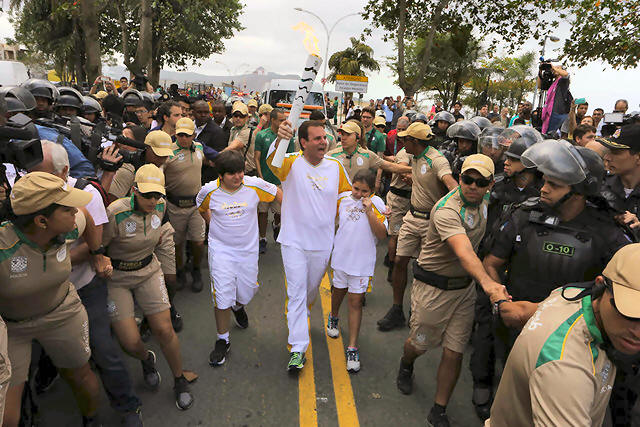 Mayor Eduardo Paes (C) carries the Olympic torch just after it was