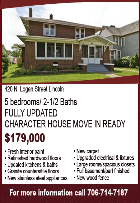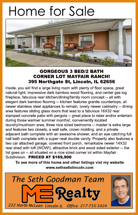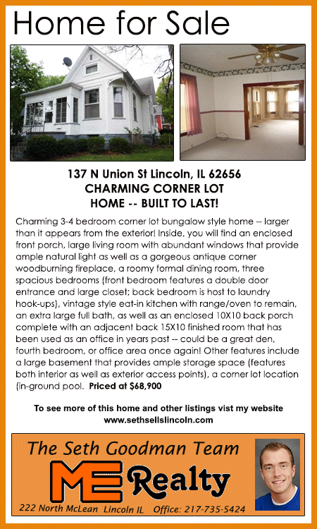 All real estate advertised in the Lincoln Daily News is subject to the Fair Housing Act for 1968 which makes it illegal to advertised "any preference, limitation, or discrimination based on race, color, religion, sex or national origin, or intention to make special preference, limitations, or discrimination."