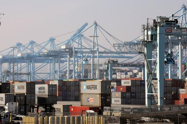 container ships sit anchored outside the Port in Los Angeles,