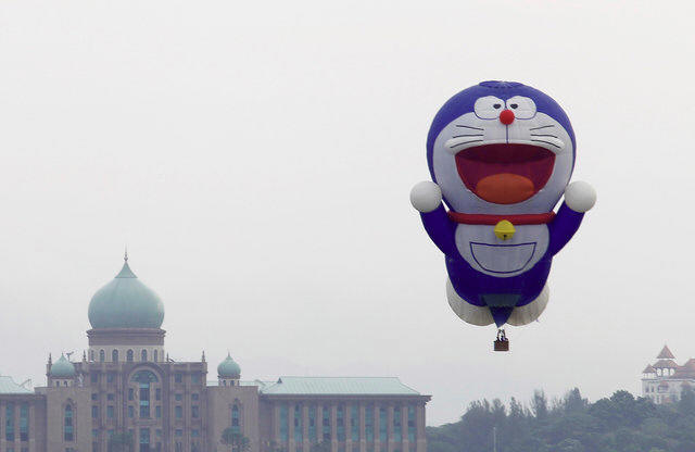 The "Doraemon" hot air balloon floats over Malaysia's landmark