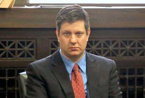 Chicago police officer Jason Van Dyke sits in the courtroom during a