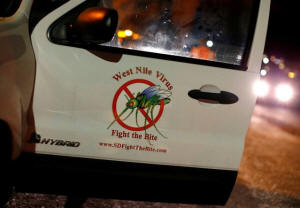 A vector control team vehicle displays a sign warning of West Nile