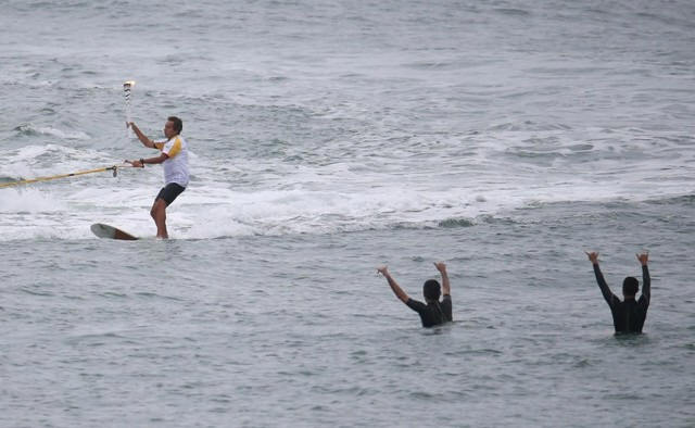 Brazilian surfer Rico de Souza carries the Olympic torch as he surfs
