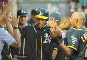 Athletics right fielder Danny Valencia (26) is greeted after scoring