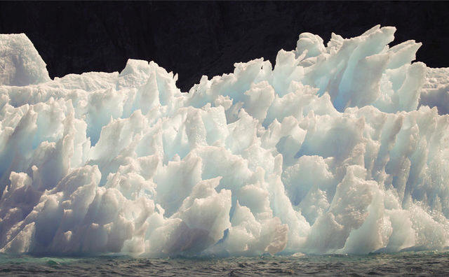 A large iceberg melts into jagged edges as it floats in Eriks Fjord
