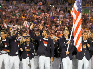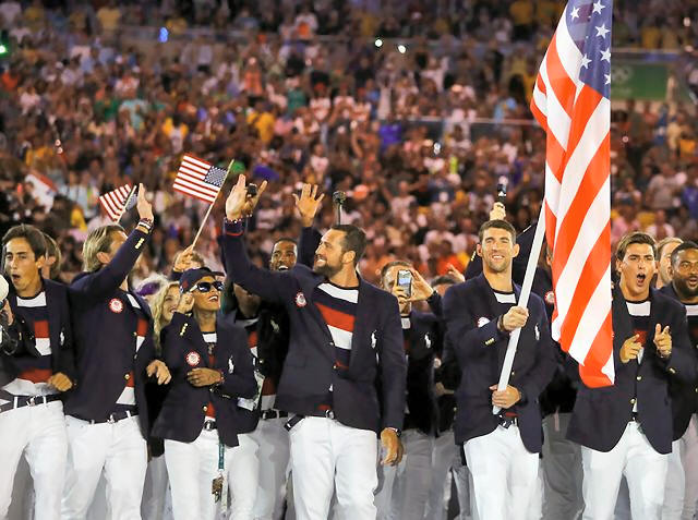 Flagbearer Michael Phelps (USA) of United States of America takes