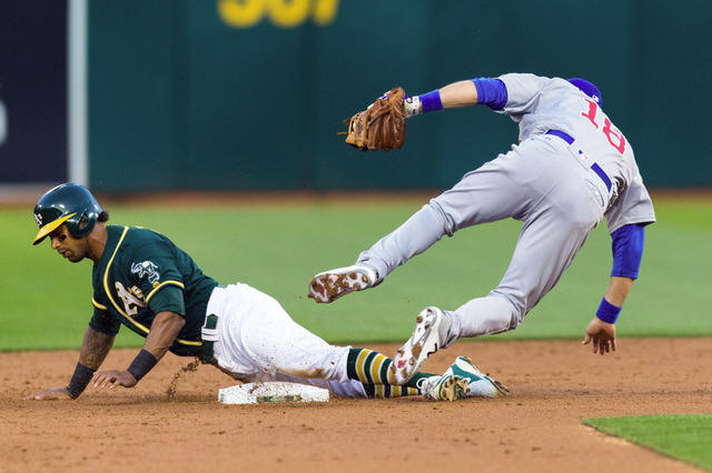Cubs second baseman Ben Zobrist (18) tags Oakland Athletics left