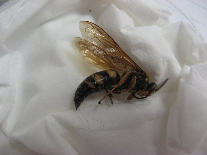 The cicada killer wasps have returned! They are actually considered beneficial insects because they control cicadas. This wasp gets its common name due to the fact that it hunts and supplies its nest chambers with a cicada, which becomes a food source for the young cicada killer. Other food sources could include katydids and grasshoppers. We are getting cicada killers now because of the beginning emergence of the dogday cicada. Cicada killers are a nuisance pest, especially when nesting in large numbers in a play area or near the house. People get concerned because the cicada killers resemble giant yellowjackets.