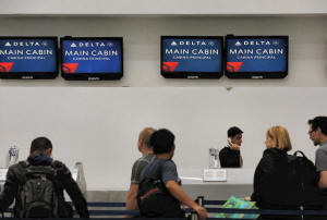 Passengers check in at a counter of Delta Air Lines in Mexico City,