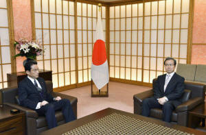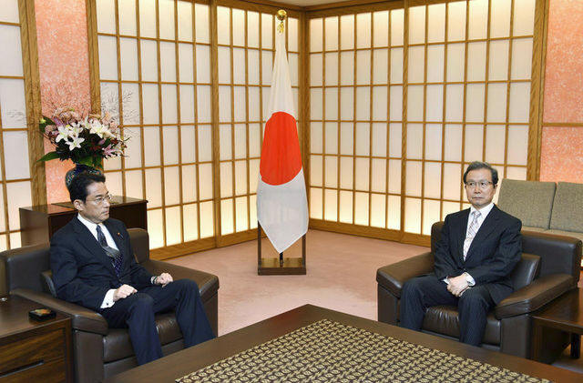 Japanese Foreign Minister Fumio Kishida (L) meets Chinese ambassador