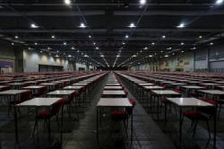 Thousands of tables are seen inside a hall at Asia-World Expo near