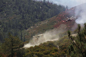 A helicopter flies overhead as a bulldozer builds a fire line during