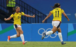 Catalina Usme (COL) of Colombia celebrates a goal with Tatiana Ariza
