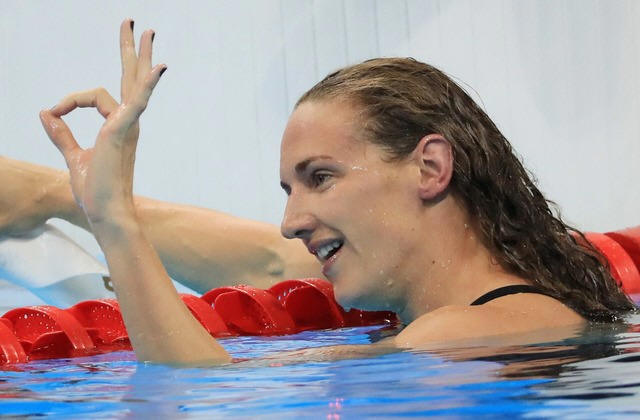 Katinka Hosszu (HUN) of Hungary reacts after winning the gold medal.