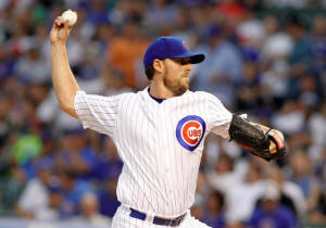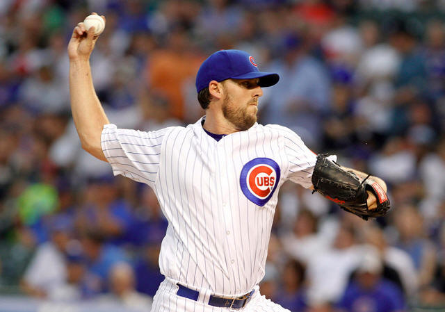 Cubs starting pitcher John Lackey (41) delivers a pitch during the