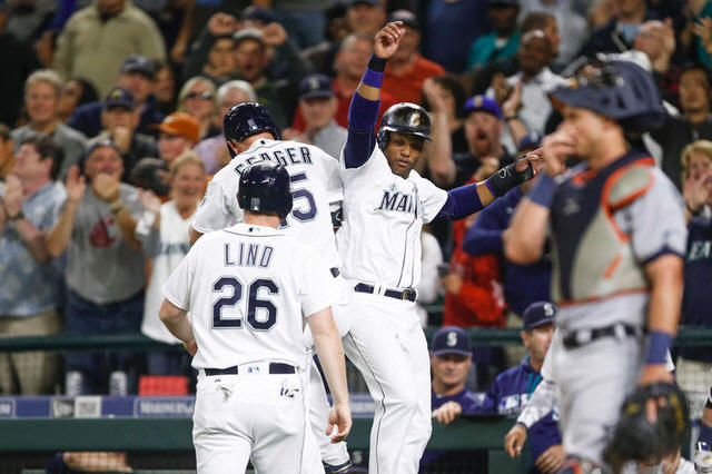 Mariners third baseman Kyle Seager (15) celebrates with second