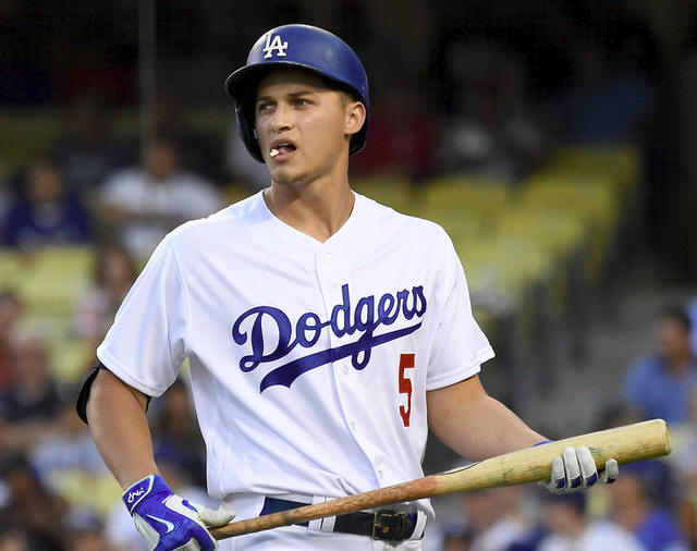 Dodgers shortstop Corey Seager (5) walks back to the dugout after