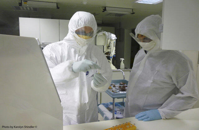 Scientists Robert Kruszynski and Girdland Flink carry out tests on