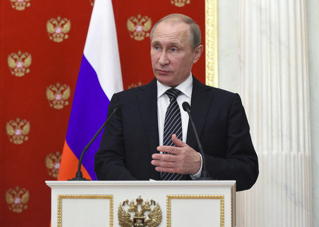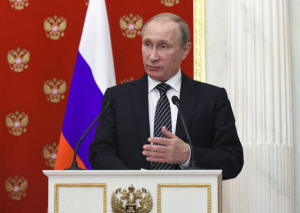Russian President Vladimir Putin speaks during a news conference after a