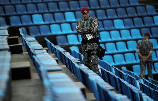 Security personnel stand guard at the equestrian venue. REUTERS/Tony