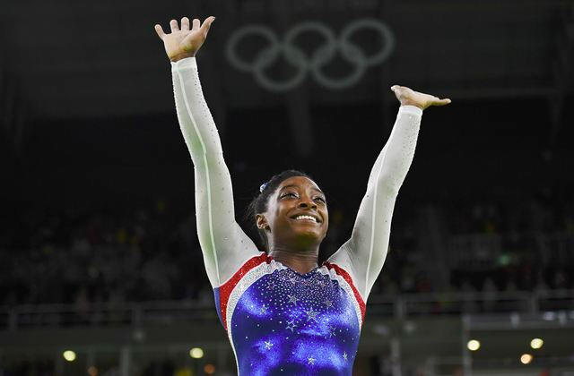 Simone Biles of USA celebrates winning gold in the women's