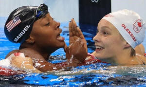 Simone Manuel and Penelope Oleksiak celebrate winning joint gold