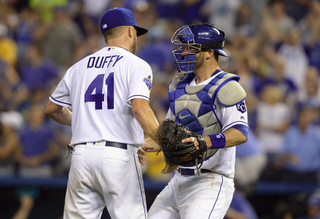 Royals relief pitcher Danny Duffy (41) celebrates with catcher Drew