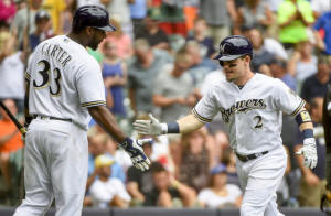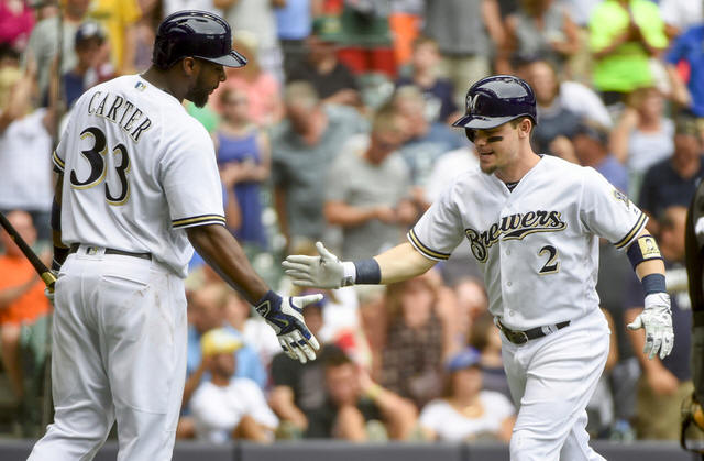 Brewers' Scooter Gennett, right, is greeted by Chris Carter, left,