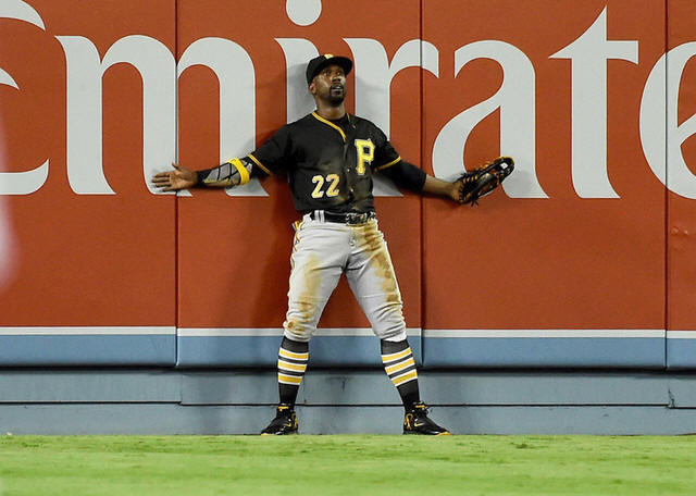 Andrew McCutchen (22) leans on the wall after making a catch off a