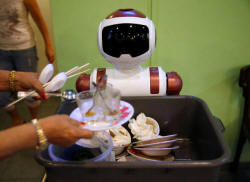 tray-wielding robot roams the eatery, offering to collect plates
