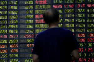 An investor looks at an electronic board showing stock information