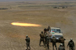 Kurdish Peshmerga forces fire a rocket toward Islamic State
