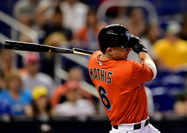 Marlins catcher Jeff Mathis (6) breaks his bat after grounded into