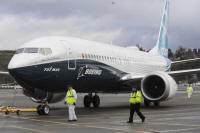 members escort a Boeing 737 MAX as it returns from a flight test