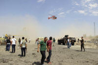 An ambulance helicopter takes off from the blast scene where two