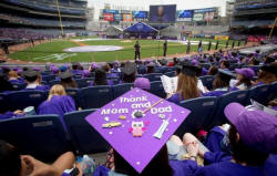 Stadium, while wearing a mortarboard with a message on it, during a