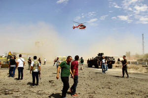 An ambulance helicopter takes off from the blast scene where two