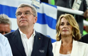 and former Romanian gymnast Nadia Comaneci are seen. REUTERS/Mike