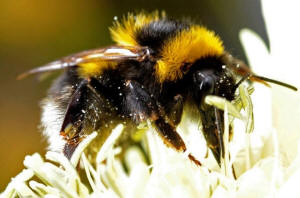A bumble bee collects pollen from a flower in a garden near York,