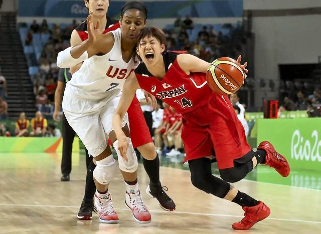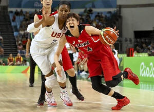 Sanae Motokawa (JPN) of Japan drives around Maya Moore (USA) of USA.